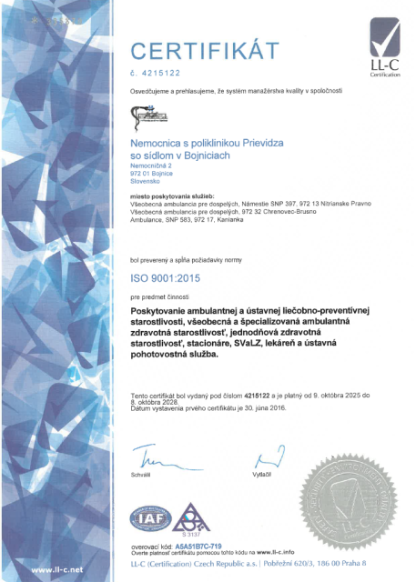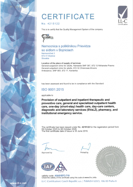V septembri 2018 naša organizácia úspešne re-certifikovala na nové požiadavky normy ISO 9001:2015 na Systém manažérstva kvality. Audit prebehol pod vedením certifikačnej spoločnosti LL-C (Certification) Czech Republic a.s.. Nemocnica tak opätovne potvrdila primeranosť, trvalú vhodnosť a efektívnosť zavedeného systému manažérstva kvality, podľa požiadaviek medzinárodného štandardu, za účelom zvyšovania kvality poskytovaných služieb a zvyšovania spokojnosti všetkých jej klientov.